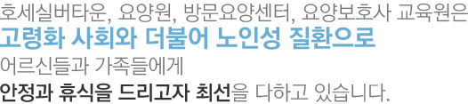 우리 호세실버타운, 요양원, 방문요양센터, 요양보호사 교육원은 사회복지학을 전공한 전문 사회복지사 개인이 설립한 시설이며 풍부한 사회복지 필드와 의료(아동,청소년,가정,노인,장애인,종합사회복지관 등 노인양의원, 노인한의원)의 경험을 바탕으로 전문복지서비스 제공을 목표로 하고 있습니다.